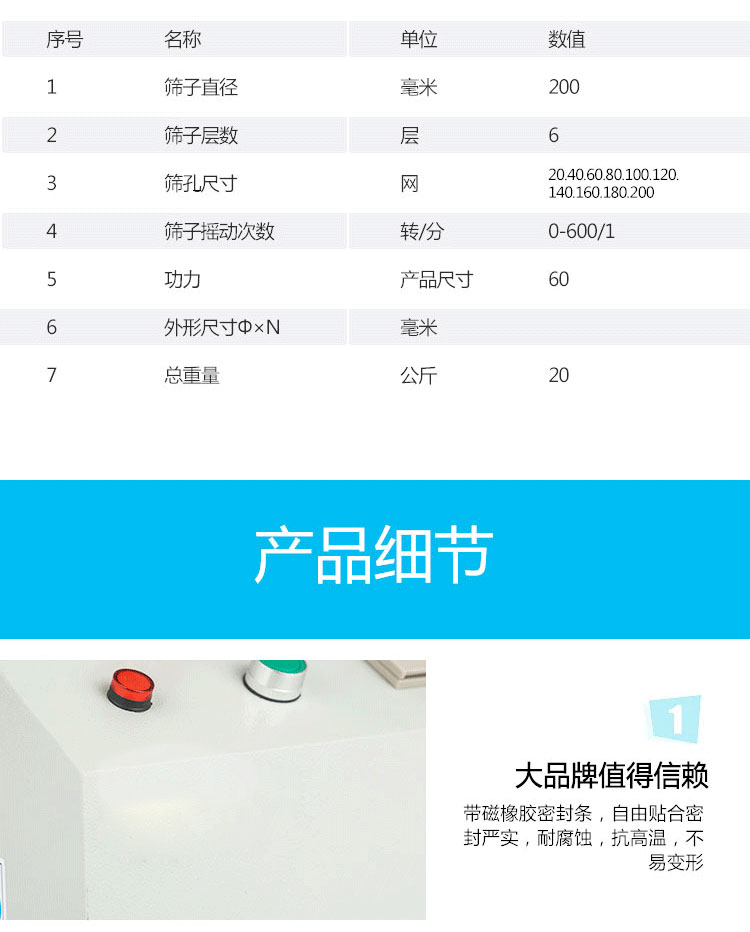 產品簡介:檢驗篩使用的注意事項:1、標準分析篩要求水平放置。2、確認電源和要求相符,并確保接地。3、振動部分不能與其他物體接觸。4...