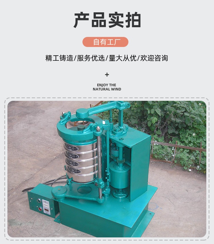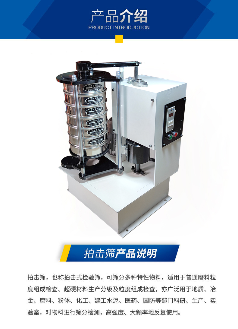 Product introduction拍擊篩又叫拍擊式標準振篩機,它是一種超精細篩分設備,用于普通磨料粒度檢查分級,超硬材料生產分級等。拍擊篩尤其適用于金剛石微粉、超硬材料行業生產分級。