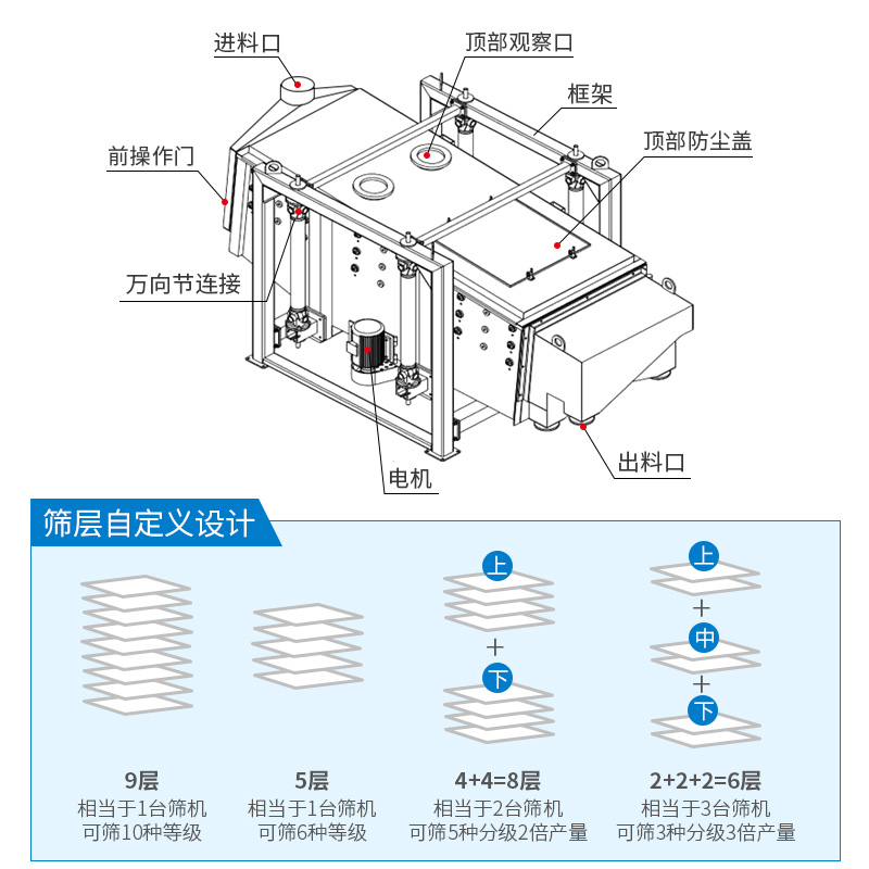 兩層篩框設(shè)計(jì);也有三層篩框的機(jī)型供客戶選擇。