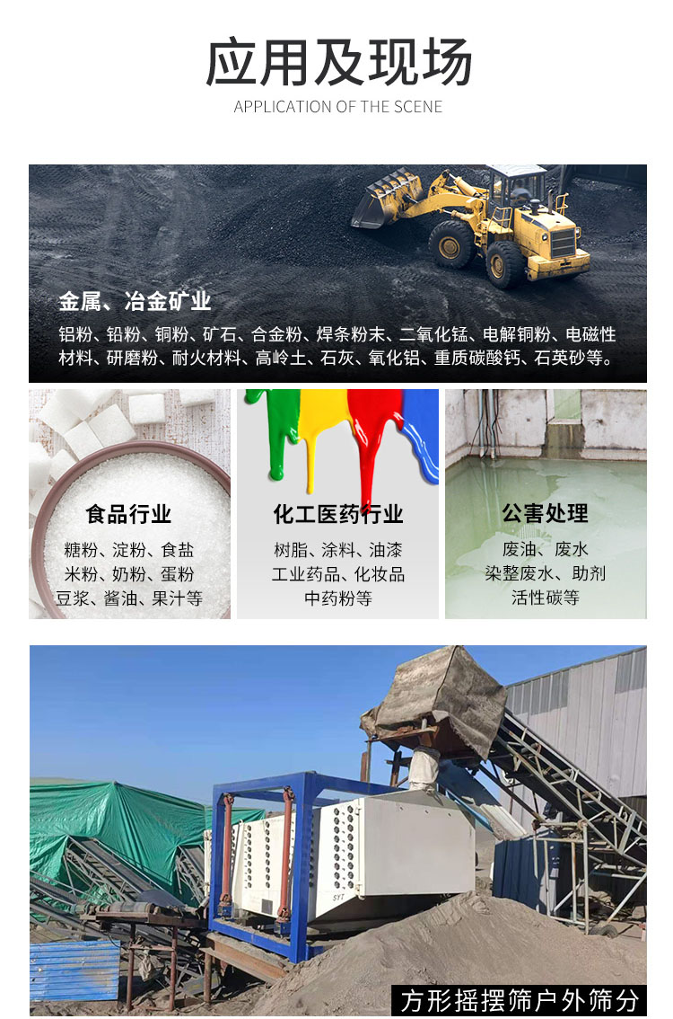 Product introduction方形搖擺篩系列篩機(jī)是滿足大產(chǎn)量、高精度需求的用戶而研發(fā)設(shè)計(jì)的一種篩分設(shè)備。它廣泛用于化工、冶金、礦業(yè)、飼料業(yè)、食品等多個(gè)行業(yè)。尤其適用于重堿、食鹽、樹脂、復(fù)合肥、大小顆粒尿素、飼料、還原鐵粉、氧化鋯、陶粒、重晶石等