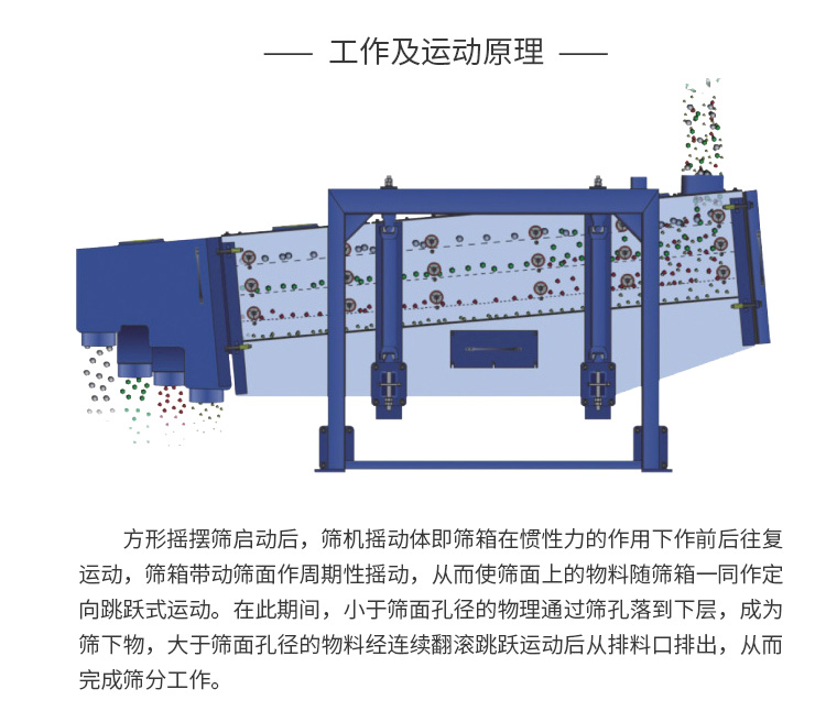 組合圓周、橢圓、直線三種運(yùn)動(dòng)方式,篩分效果好。適合多種物料篩分。
