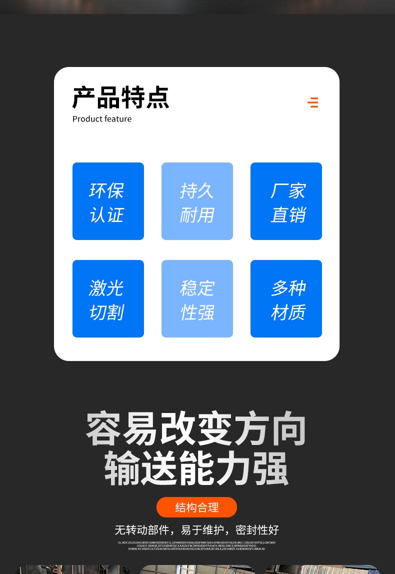 Product introduction風送斜槽是一種用于輸送干燥粉狀物料的氣力輸送設備又稱空氣輸送設備,由數個鑄鋼板鑄成的槽子連接而成,并沿其輸送方向布置成一定的斜度,槽子的上下殼體中間夾有氣層,物料隨氣體流動輸送。