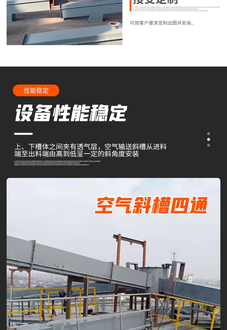 空氣輸送斜糟適用于礬土、煤粉、煤灰、氧化鋁、石膏粉、面粉、水泥、磷礦粉等易流化的粉狀物料的輸送,對水分含量高、流態化性能差的物料不宜使用。在水泥工業中常用于輸送含水量≤1%,溫度≤150℃水泥和生物料。